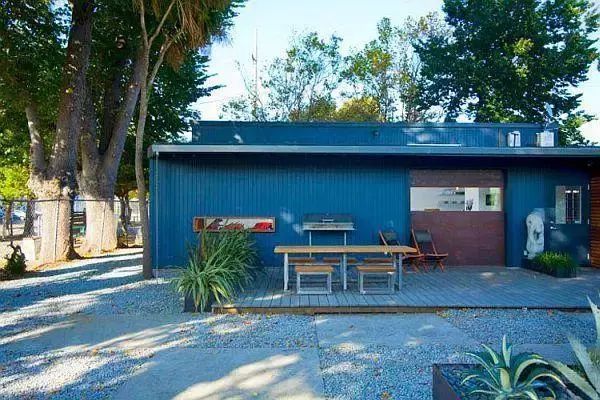 这个宾馆是由回收的建造的,喷成蓝色、切割成2部分,安装上玻璃和大型的滑动门。